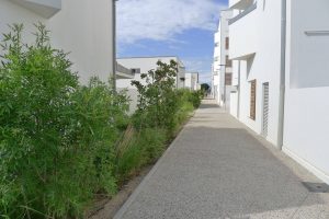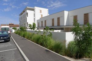 Des plantations d’arbres structurent les voies, les promenades, les placettes, tandis que les larges parterres de plantes méditerranéennes, bien adaptées au site très venté et ensoleillé ici, participent autant à la biodiversité qu’à la qualité sensorielle des espaces extérieurs.
