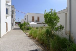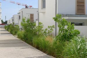 Les noues de rétention, qui longent les chemins, sont plantées en graminées, et cépées d’érables champêtres, d’arbres de Judée.